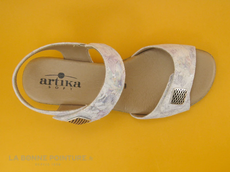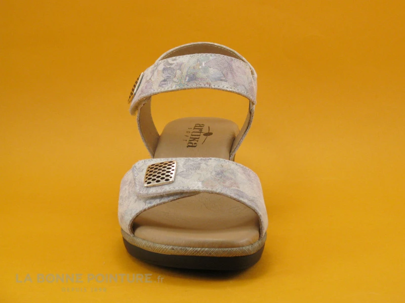 Cette sandale Femme Artika Naty Virginia est en cuir velouté blanc argenté, imprimé de fleurs aux tons pastels.