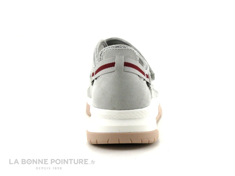 Cette basket confortable Femme Jana est en velours et tissu mesh gris clair, avec un ruban bicolore gris et bordeaux à l’arrière.
