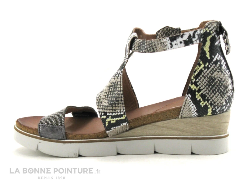Cette sandale compensée est en cuir façon serpent, aux tons de noir, blanc, beige kaki et vert lime.