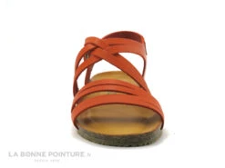 Ce nu-pieds Femme à talon épais est en cuir souple marron camel, avec une fine lanière de cuir qui enlace et longe les brides de la chaussure Metamorf Ose Nareux.
