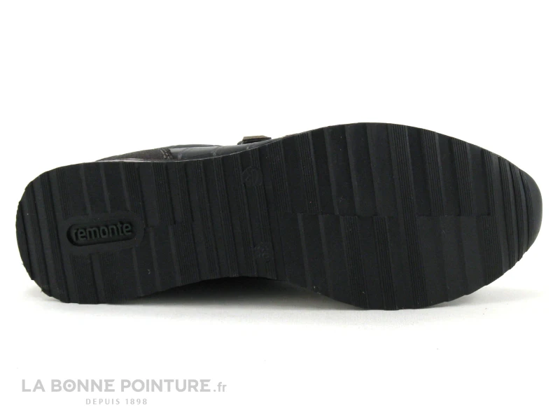 La semelle de marche des baskets noires Remonte R2532-03 est souple, épaisse d’environ 3.5 cm au talon.