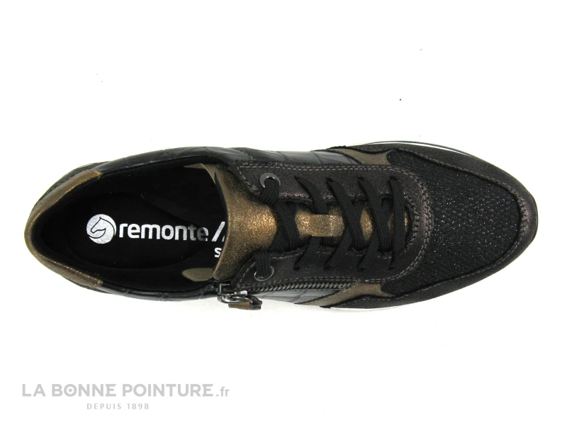 Ces sneakers Femme Remonte se démarquent avec des parties noir croco, bronze et marron métallisé.
