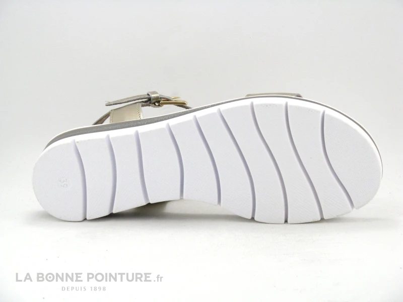 La semelle de marche est souple, blanche avec des lignes grises et argent. Le talon compensé du nu-pieds Shoelab mesure environ 3.5 cm.