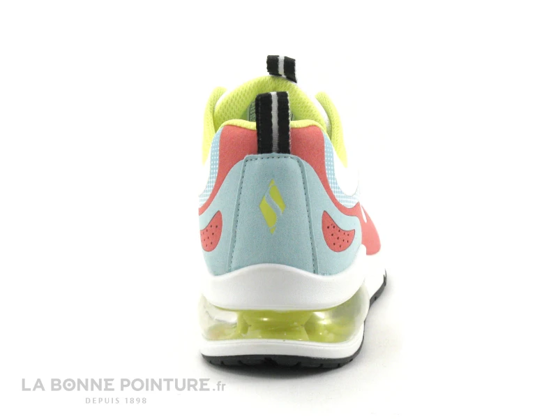 Cette basket Femme Skechers Uno Breath Easy est en textile et matières synthétiques résistantes blanc, vert d’eau, rose et jaune.