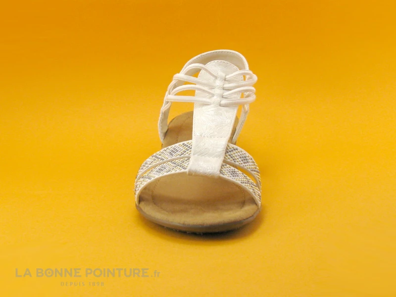 Ce nu-pieds Femme blanc et argent s’enfile trĂšs facilement grĂące aux 4 Ă©lastiques qui traversent la bride salomĂ©.