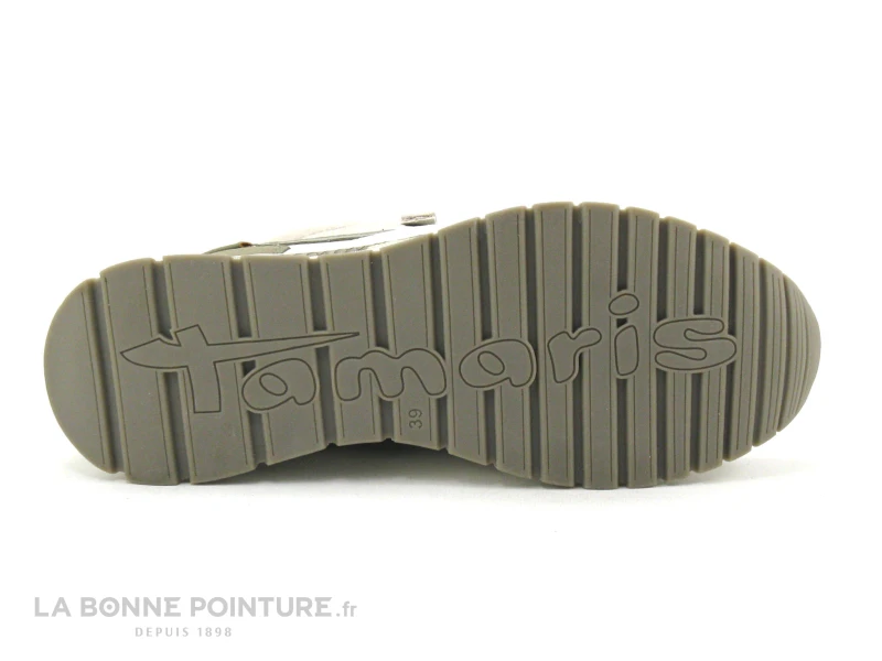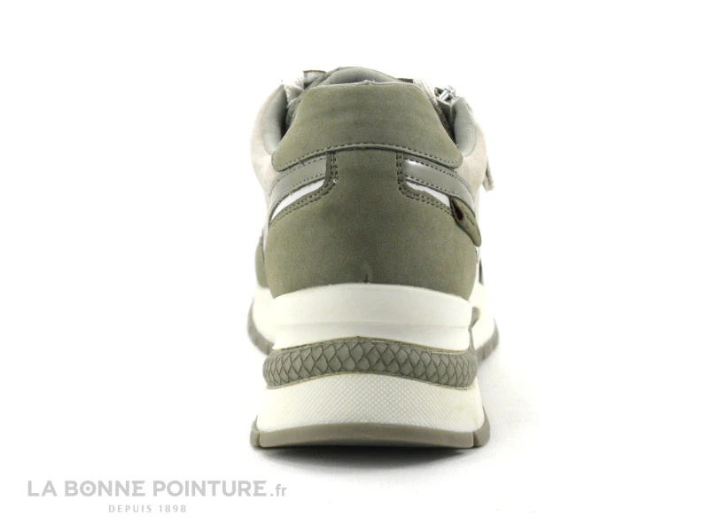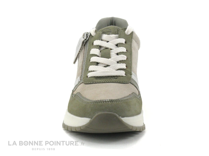 Cette sneakers tendance Femme Tamaris mélange cuir velouté et simili cuir aux tons de kaki, beige et blanc.