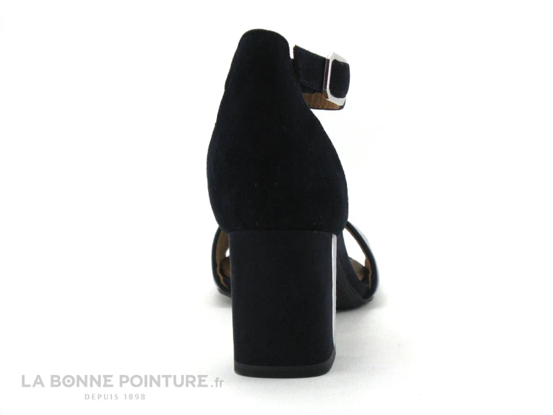 Ces sandales Femme à talon haut mélangent un cuir velouté bleu marine et bleu clair grisé.