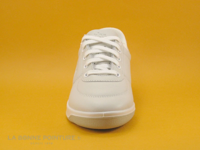 Le dessus des chaussures est en cuir blanc aspect grainé, gravé du logo TBS sur la tranche extérieure et le contrefort arriÚre.